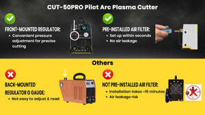 Darüber hinaus ermöglicht der eingebaute Luftregler auf der Vorderseite eine einfache und präzise Einstellung des Luftdrucks, wodurch sich der SSIMDER CUT-50 PRO von der Konkurrenz abhebt. Verbessern Sie Ihre Schneidprojekte noch heute mit diesem vielseitigen und leistungsstarken Plasmaschneider.