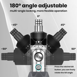 Multi-function handle design, you can switch the bit/socket/long bit as you like to meet various daily needs. Press the ratchet bit button, you can freely rotate the bit angle, 180° angle adjustable, multi-angle locking, more flexible operation.